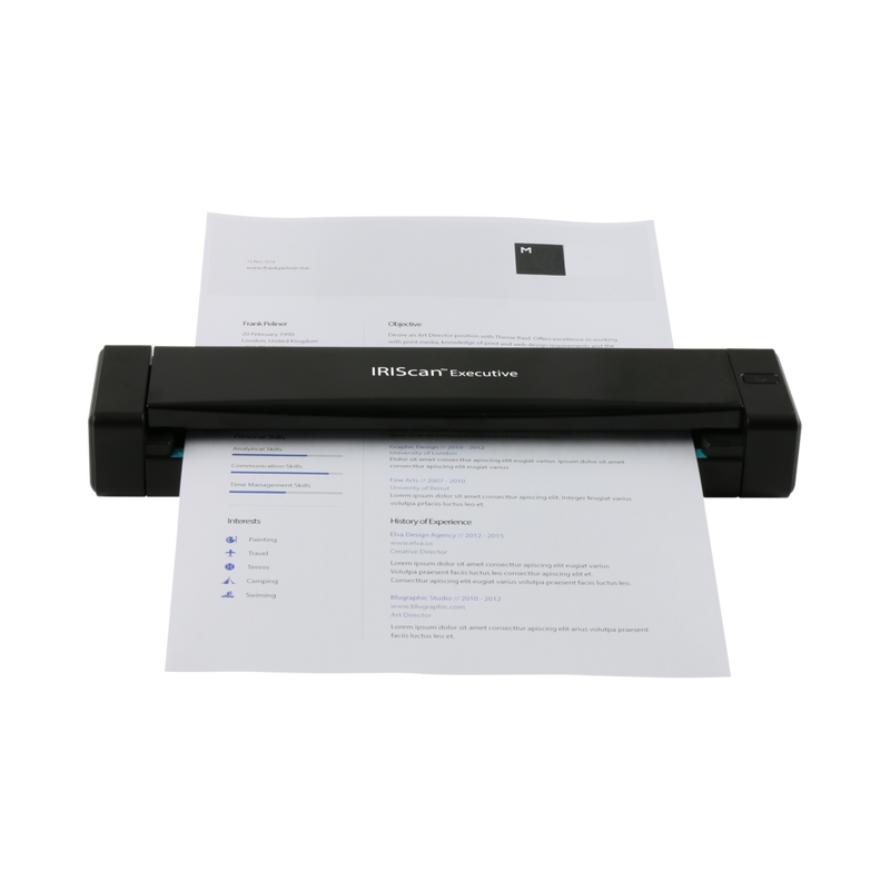 Fast, compact and lightweight, the IRIScan Executive 4 duplex scanner easily converts receipts, photos, business cards and laminated documents into editable digital files, with high-resolution image capture and optical character recognition software.
